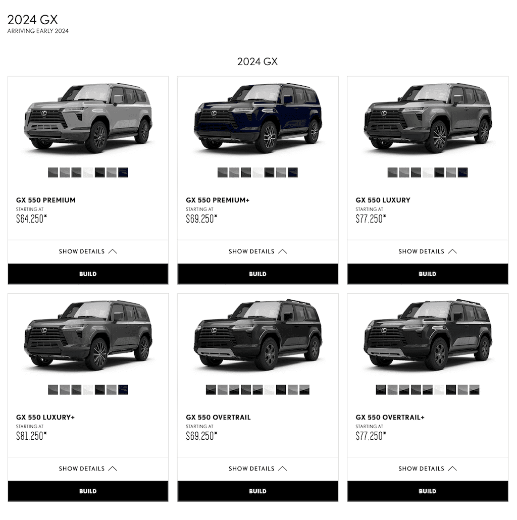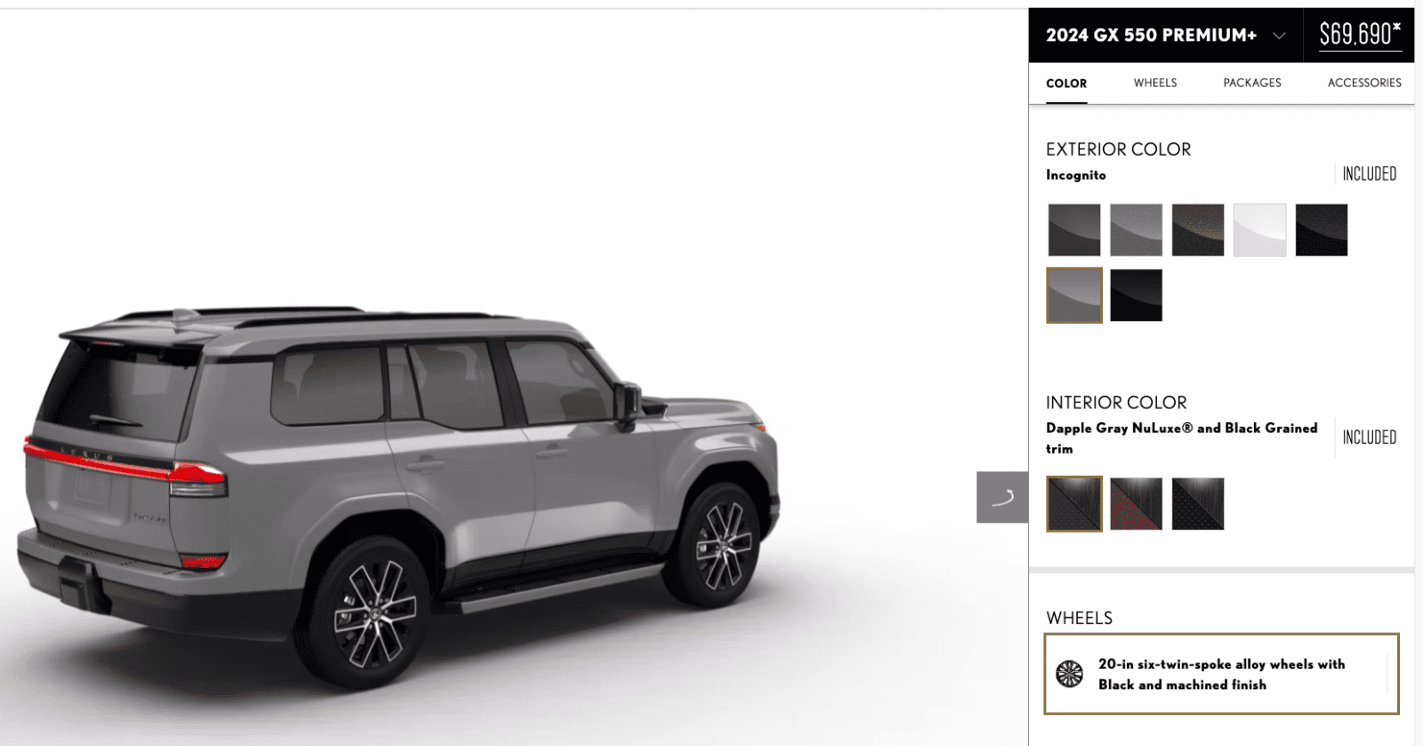 Lexus has launched the build tool that allows you to customize and build your own version of the GX550 on their website! This interactive tool offers a variety of options, letting you choose from different colors, features, and accessories to create a GX550 that perfectly matches your style and preferences. It's a great way to explore all the possibilities and configurations this vehicle has to offer before making a decision. So, if you've been considering the GX550, head over to Lexus.com and have fun designing your dream car!