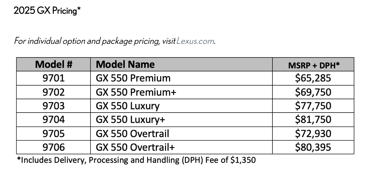 The 2025 GX is assembled at the Tahara plant in Japan and is expected to arrive at dealerships in early 2025.