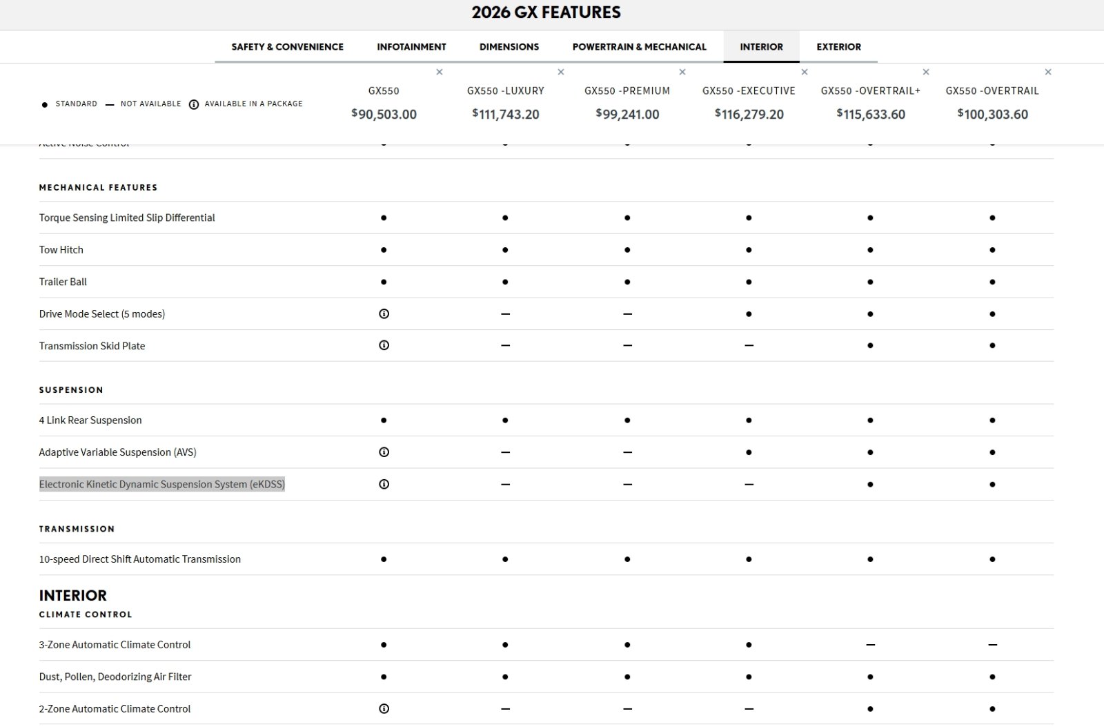 It's my understanding that the EKDSS option for the GX550 in the US market is only available in the OT and OT+ package. I just noticed today for the 2026 model year, the Canadian market GX550 has EKDSS availability across all optional packages. For Canadian GX buyers, this means that EKDSS is standard regardless of which package or trim level you choose. Information provided from Regency Lexus in Vancouver, BC, Canada. Canadian GX buyers (for 2026 model year) should confirm and verify with your Lexus sales rep if EKDSS is standard. If true, this is great news for all Canadian GX buyers.