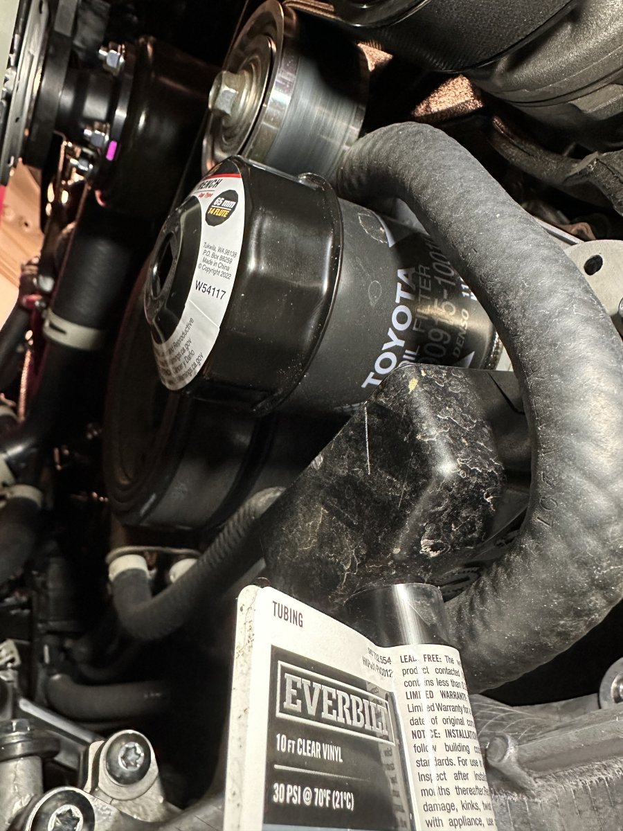 When I went to remove the oil filter, I first installed the tubing. Regardless, some of the oil went behind the piece that's supposed to direct it. Next time I'll put a paper towel up there to catch this runoff. The instructions on the oil filter said to go until it makes contact and then turn it another 3/4 turn. I turned it until it made contact but could only get it go about 3/8 of a turn more. There was no way that it was going to go 3/4 of the way around unless I used a wrench. That seemed excessive, so I just left it where I could get it by hand.