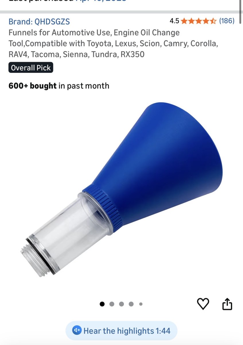 Couple tools that work great for oil change: oil filter wrench, screw on oil funnel, and hose for draining oil filter.