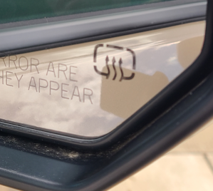 The passenger rear door mirror shows a defrost icon: