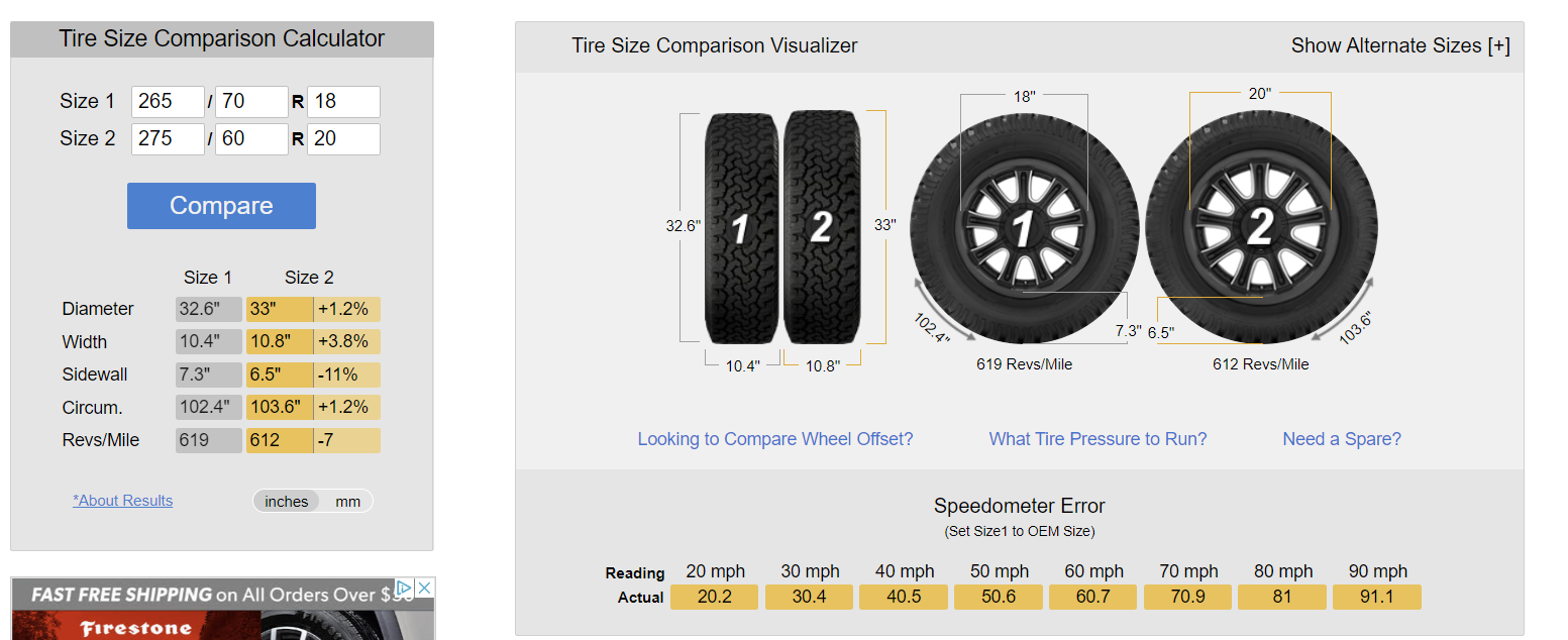 OT Stock Tire Size is 265/70/18. Going to a 33" size tire on the 20-inch wheel is not much difference.
