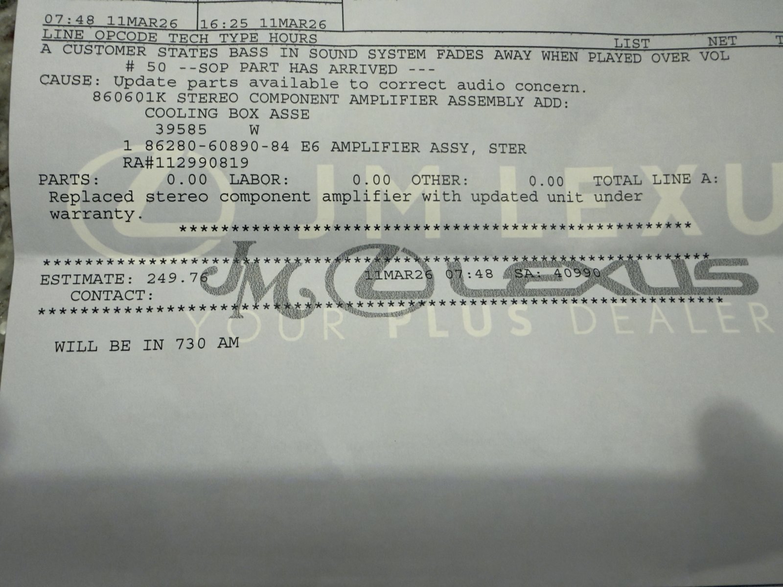 Got my amp replaced yesterday (finally) on my 2024 GX 550 OT+ under warranty. Definitely better (IMO), still a bit lacking, but worth getting it done if you can. The bass held up at 50+ and didn’t cut off to the “tinny” sounds. I’d like to flip out the speakers and, hopefully, get a more “quality” sound, especially in low range. My fourth documented complaint since October 2024. JM Lexus in Margate Florida came through with a three week wait time! Was told on prior occasions by other dealerships, that a fix wasn’t available but the complaints were a “known issue.” It really is an improvement!