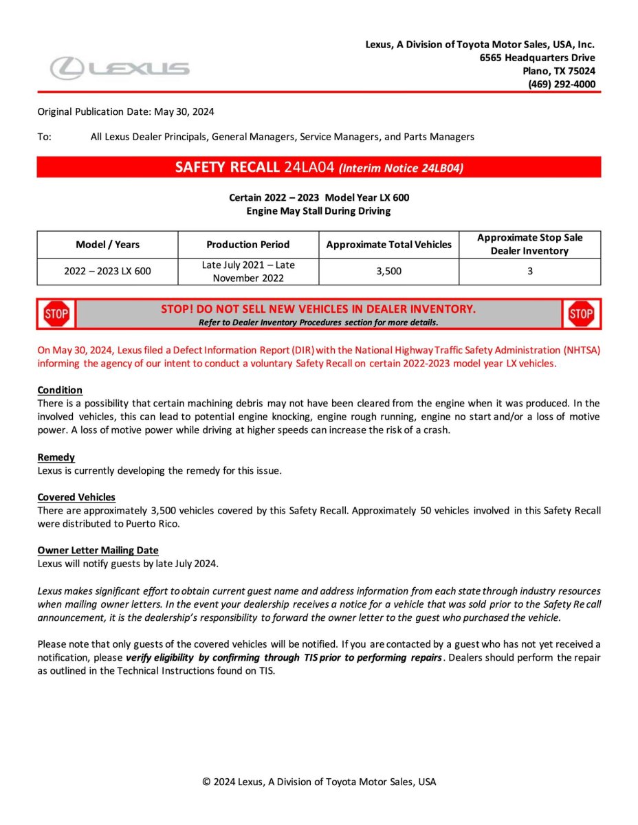 PLANO, Texas (May 30, 2024)—Toyota is conducting a safety recall involving certain model year 2022–2023 Toyota Tundra and Lexus LX (conventional gas model only) vehicles in North America. Approximately, 102,000 Toyota and Lexus branded vehicles are involved in this recall in the U.S.