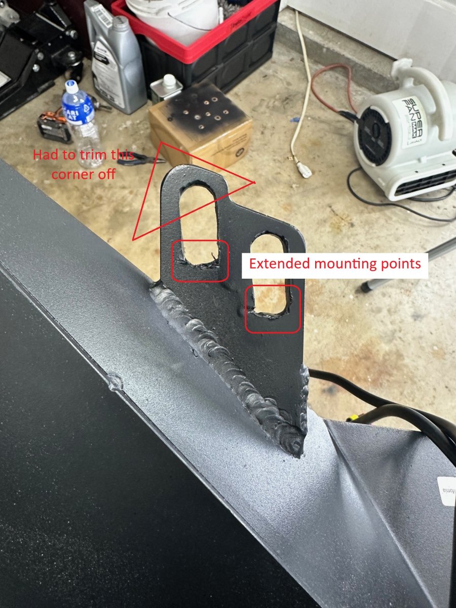 Long story short, I wanted to make this thing look good so 1) I cut new fog light mounting holes, 2) extended the mounting holes on the passenger wing and 3) trimmed off a piece of the passenger wing mounting bracket to get this to fit flush. It took me basically 3-4 days b/c I was using my drill + mini die grinder to cut through 1/2" of steel... plus hours of fitting, taking off and refitting and figuring out what I needed to modify.