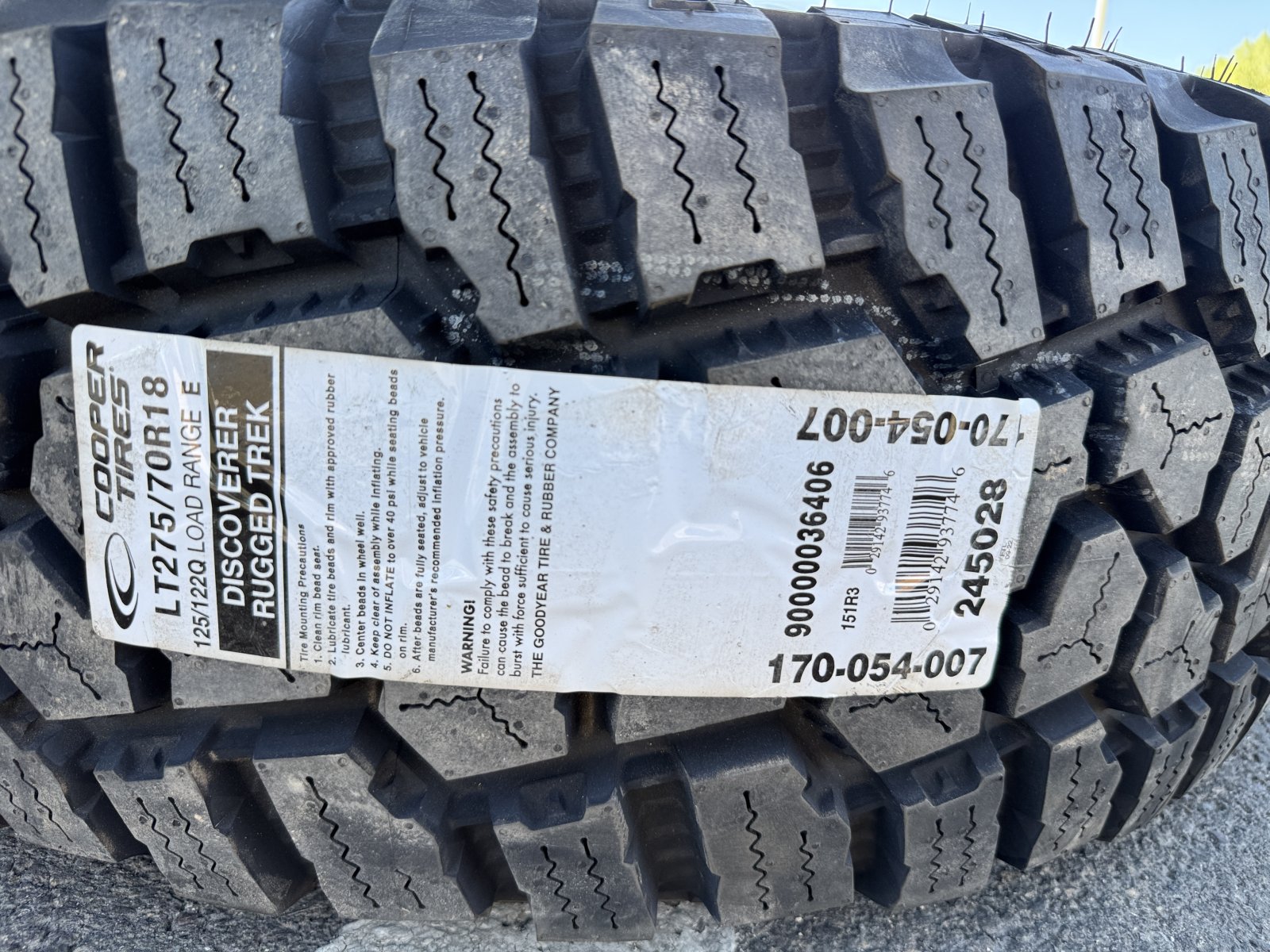 That led me to the Cooper Discovery Rugged Trek 275/70-18, load E, stated 33.7” (both mfr website and Tire Rack), stated section width 11.1”.