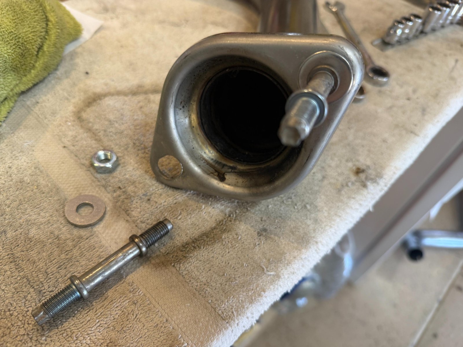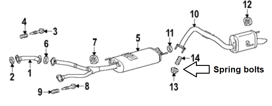 Once I removed the stock exhaust, I had to break the pins free from the stock flange by securing the stock exhaust in a vice and then screwing the spring bolts back down tight (without the springs) and over-torquing them a bit to break the pins free. I applied a little PB Blaster first. Then I had to grab the pin with a vice grip to get the bolt back off, then the pins spun free by hand. The stock square bolts on the backside of the flange that the pins screw into are welded in place.