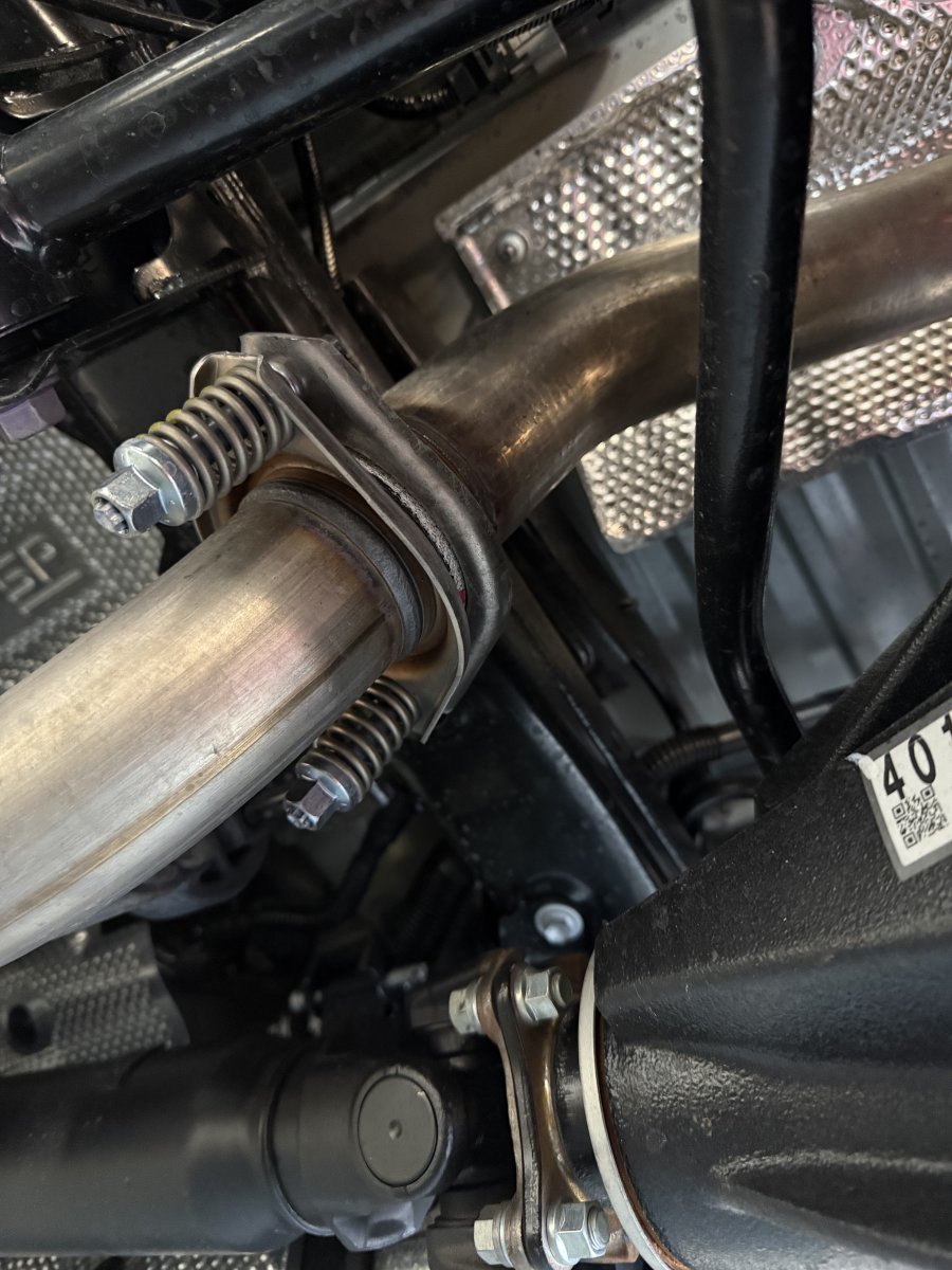 I slipped the clamp on the tailpiece, fit everything together loosely, got the rubber hangers in place (a little dab of bearing grease helps), and then torqued down the spring bolts and then the clamp bolt.