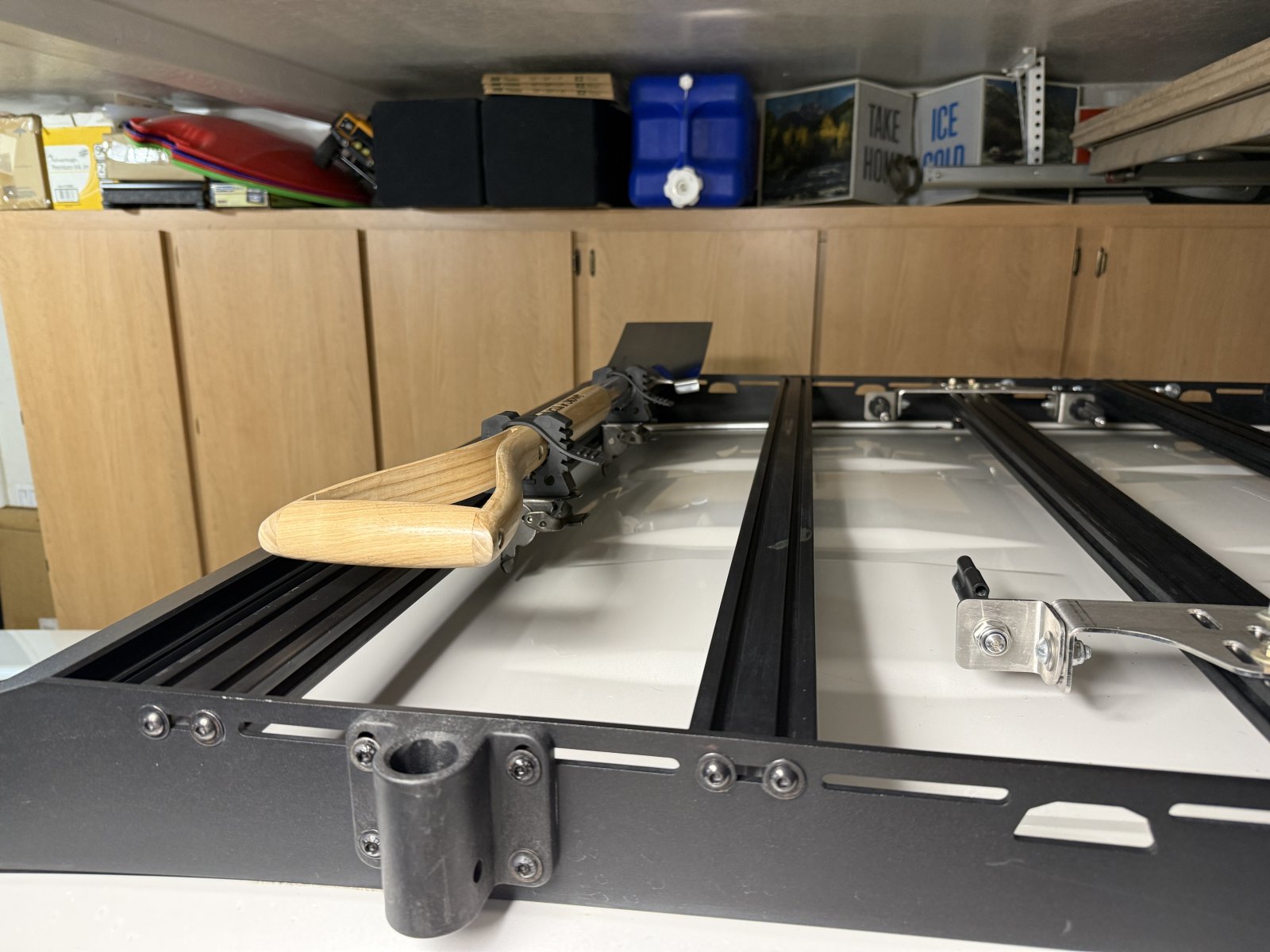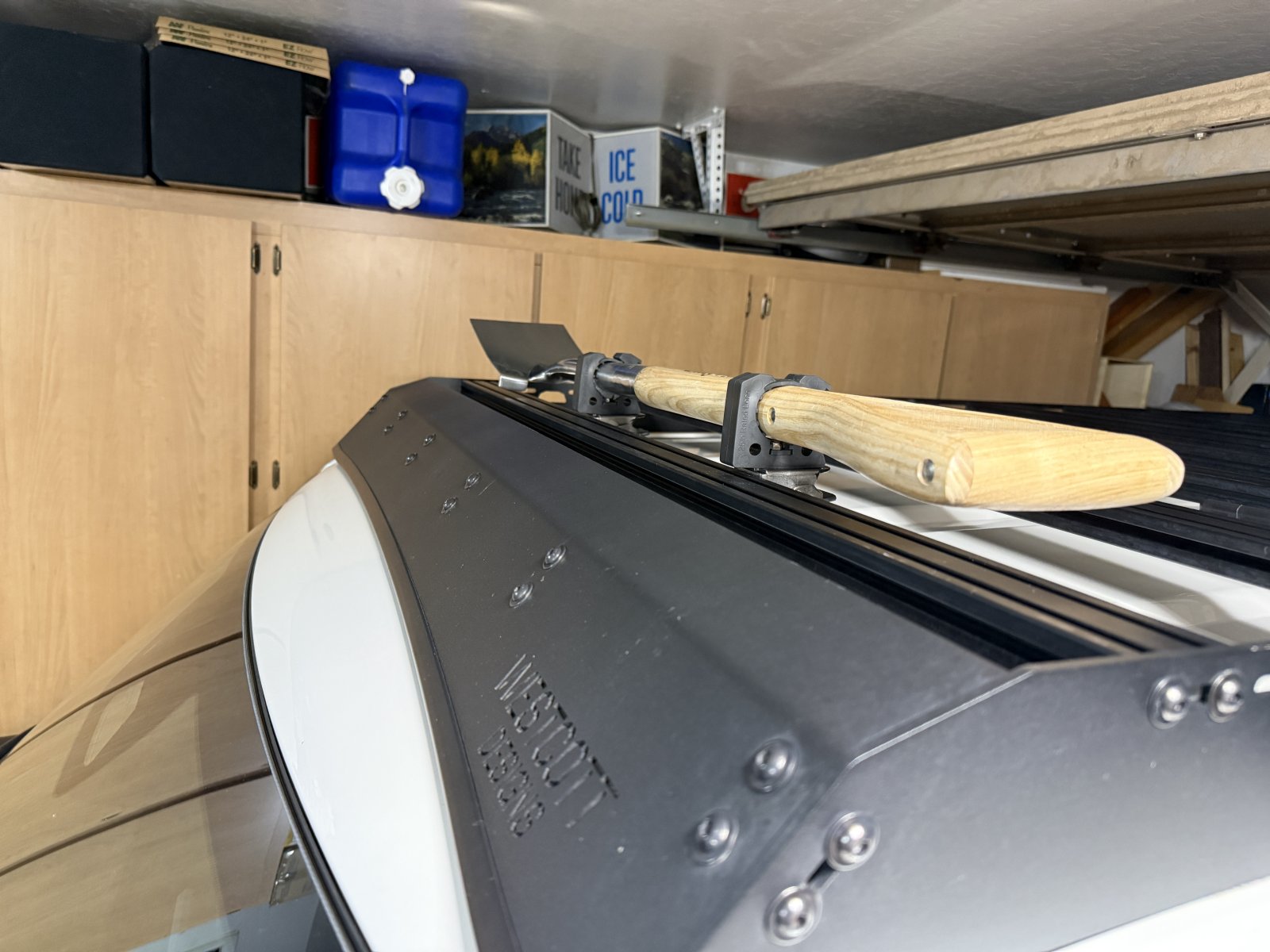 In keeping with my quest to keep my roof rack as low-profile as possible, I didn't want to bolt on a shovel mount that stuck up a few inches, thereby losing my garage clearance. I also don't really have clearance on the side of my low-profile rack to strap on a shovel without hitting the body of the truck. Most shovel mounts from the Armageddon crew are also nearly as expensive as the $300 Armageddon shovels. I figured I'd just be throwing the shovel in the cargo bay with all my other junk and then I had an idea.