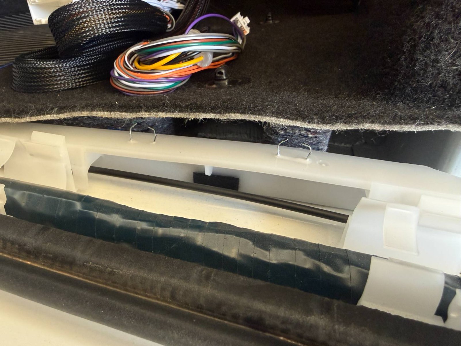 The rest of the job was easy. Route all the wires through the second carpet opening per the instructions, I set all the Beatsonic gains at 1 tick from all the way up, plug in the Beat Box, bring the protective sheath all the way up, secure it with a small zip-tie, shove the Beat Box back onto the rear floor, move to the rear door. I also used small zip ties to secure the loose wires where the sheath didn't cover to keep them manageable. You have stuff and coil a lot of wiring under the carpet between the stock amp and the second carpet opening.