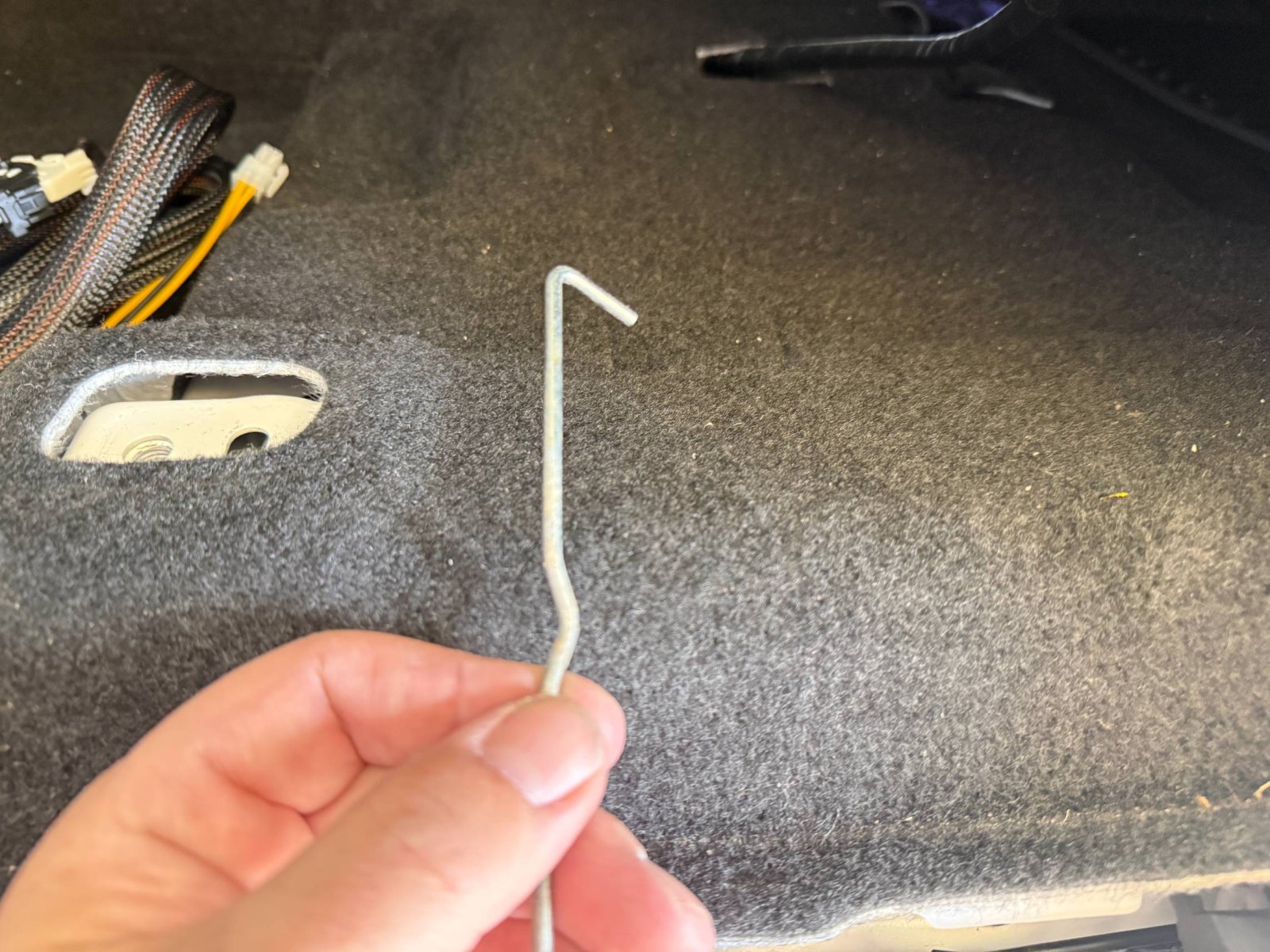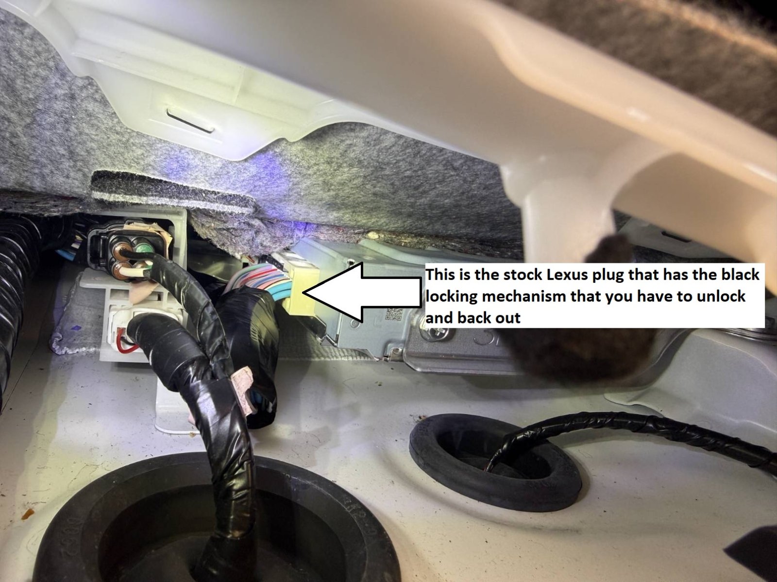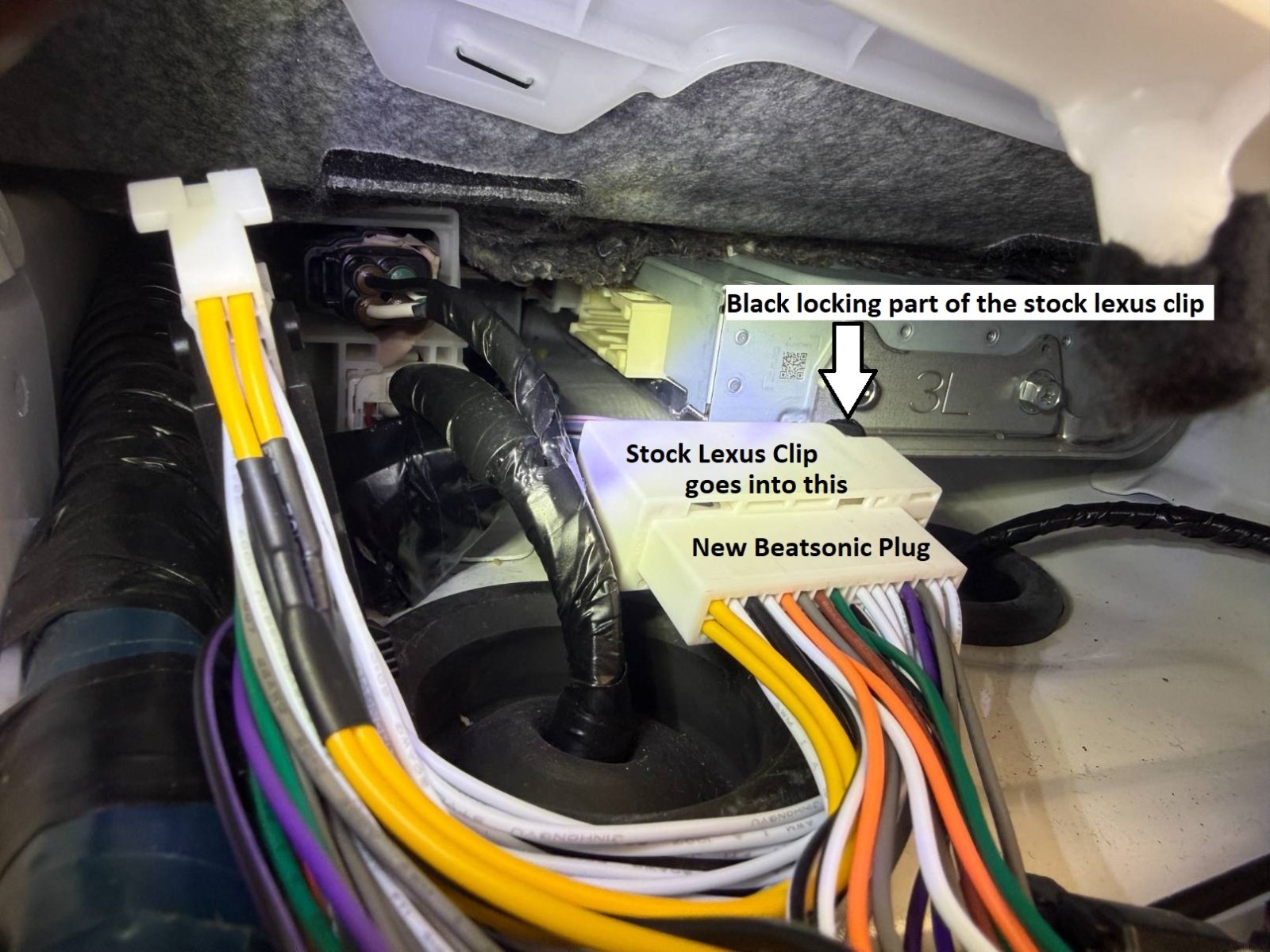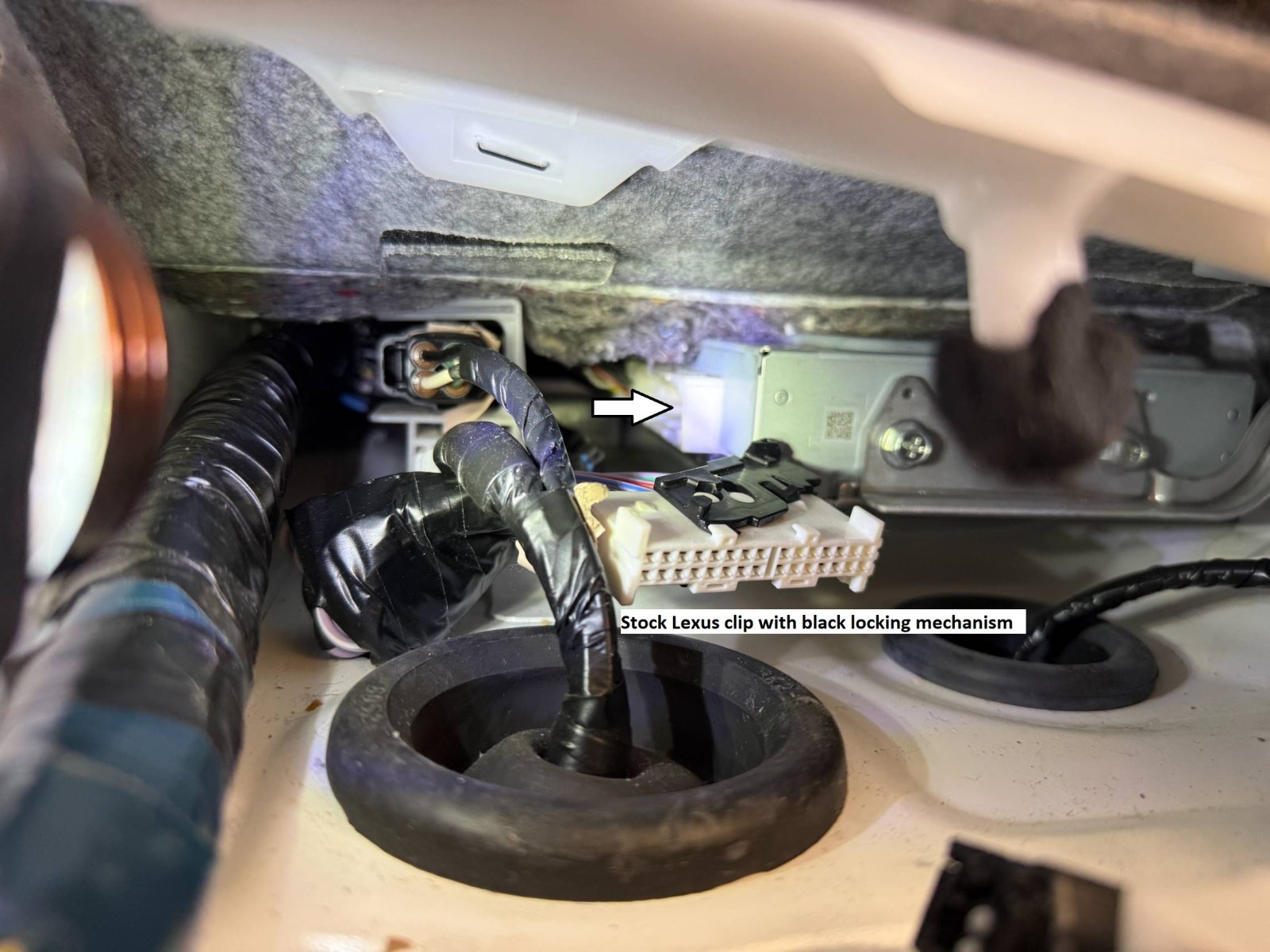 My fat fingers couldn't press the black locking mechanism button to release the stock Lexus plug that is plugged into the stock amplifier so I used a tent stake to reach in and press the button and then I jammed my hand in and was able to yank back the clip. Then it took an act of God to back the actual plug out of the amp - there are other wires & clips in the way that prevent the main clip from backing out. I just pushed the other clips forward to make some room.