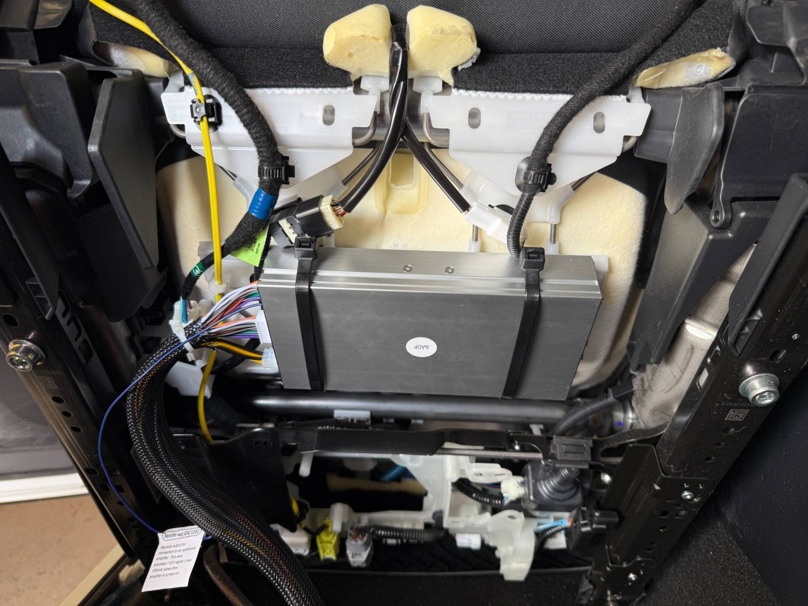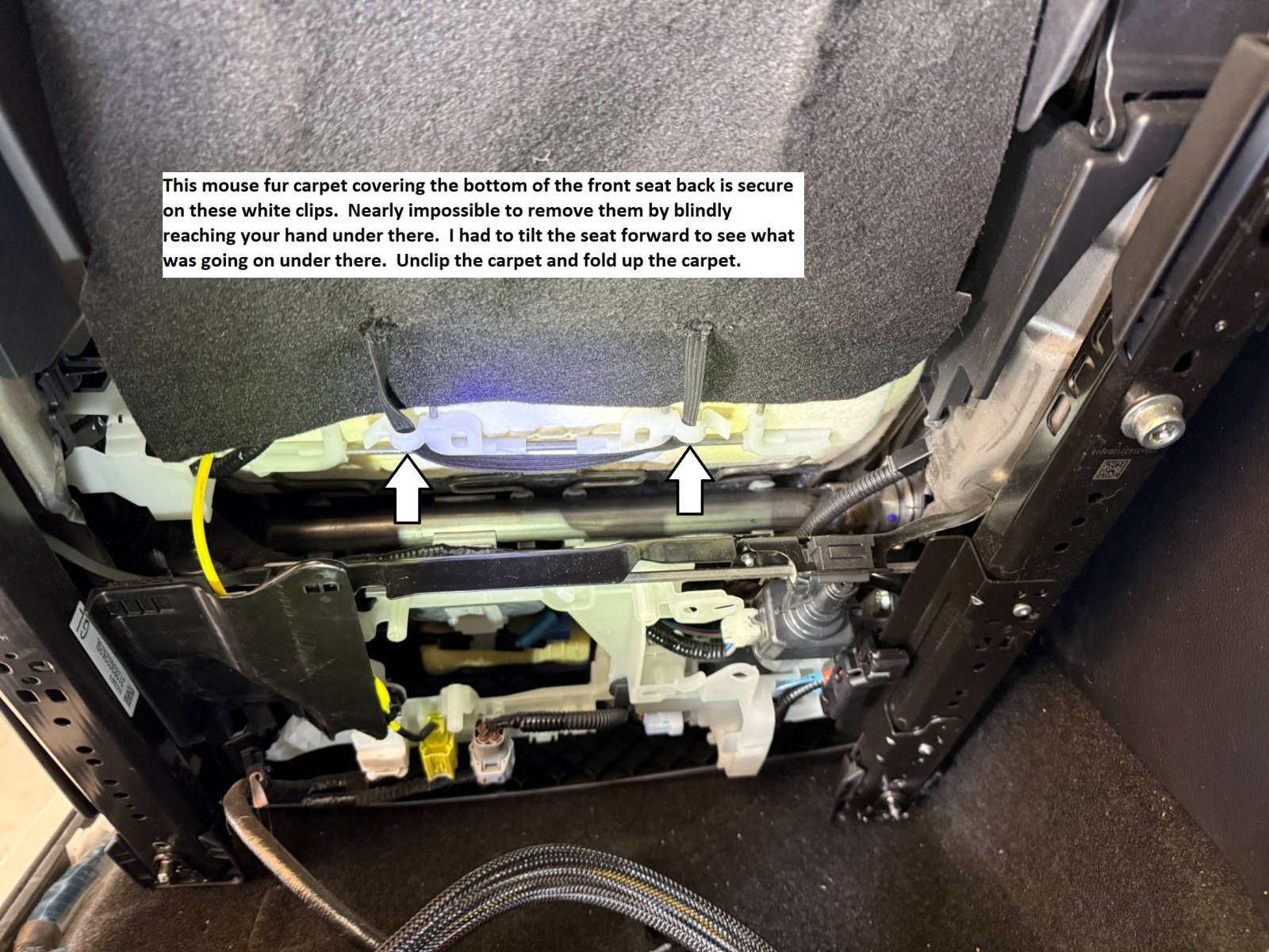 Then I tilted the seat forward, removed the headrest, and used the seat back tilt feature to stuff the top of the seat back up into the headliner by the sun visor. This held the seat in a forward-tilt position. Then I sat in the back seat and the mounting the Beat Box was pretty simple. First I removed the elastic holding down the mouse fur carpet covering the bottom of the front seat, fold the carpet up and tuck it into the seat back pocket. I got extremely frustrated trying to blindly unsecure the elastic before I decided to tilt the seat forward so I could see what I was doing.