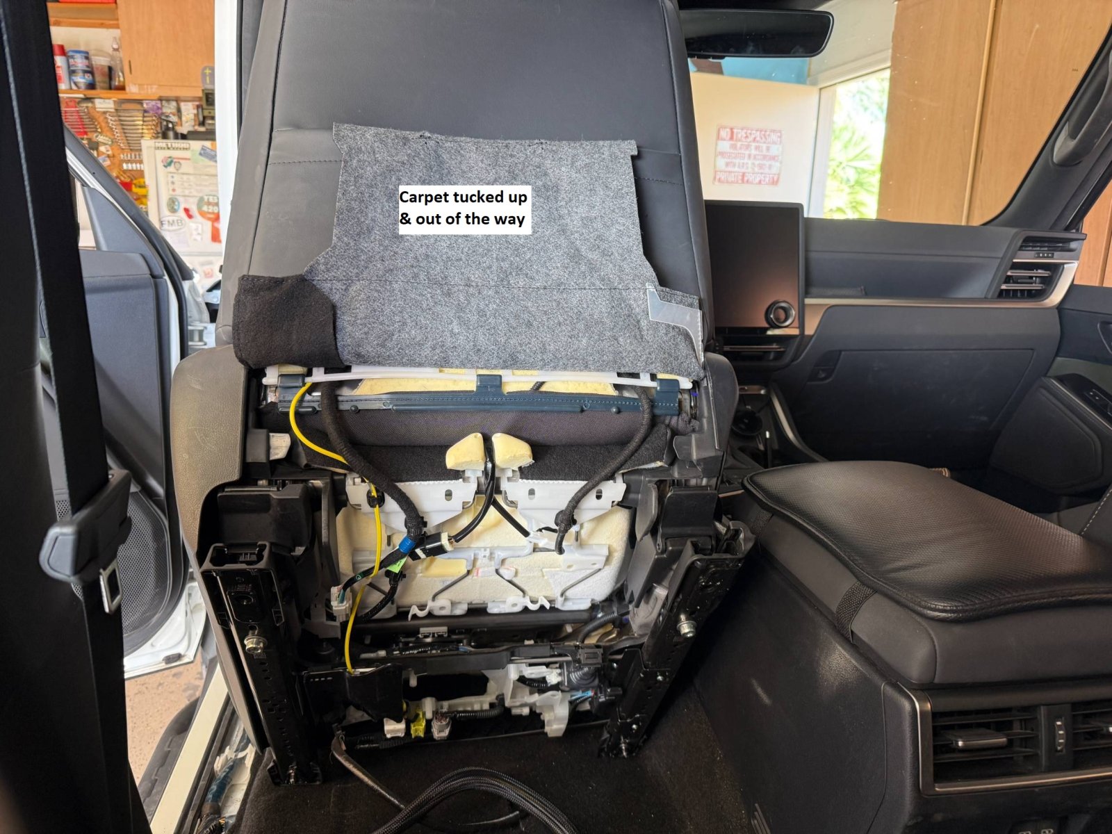 First step, undo all seat bolts and tilt that seat way back. Pull the door sill trim and pull up the carpet. Get rid of the evil sharp staples that get yanked out of the carpet or they will cut you. I just clipped them back with a wire cutter.
