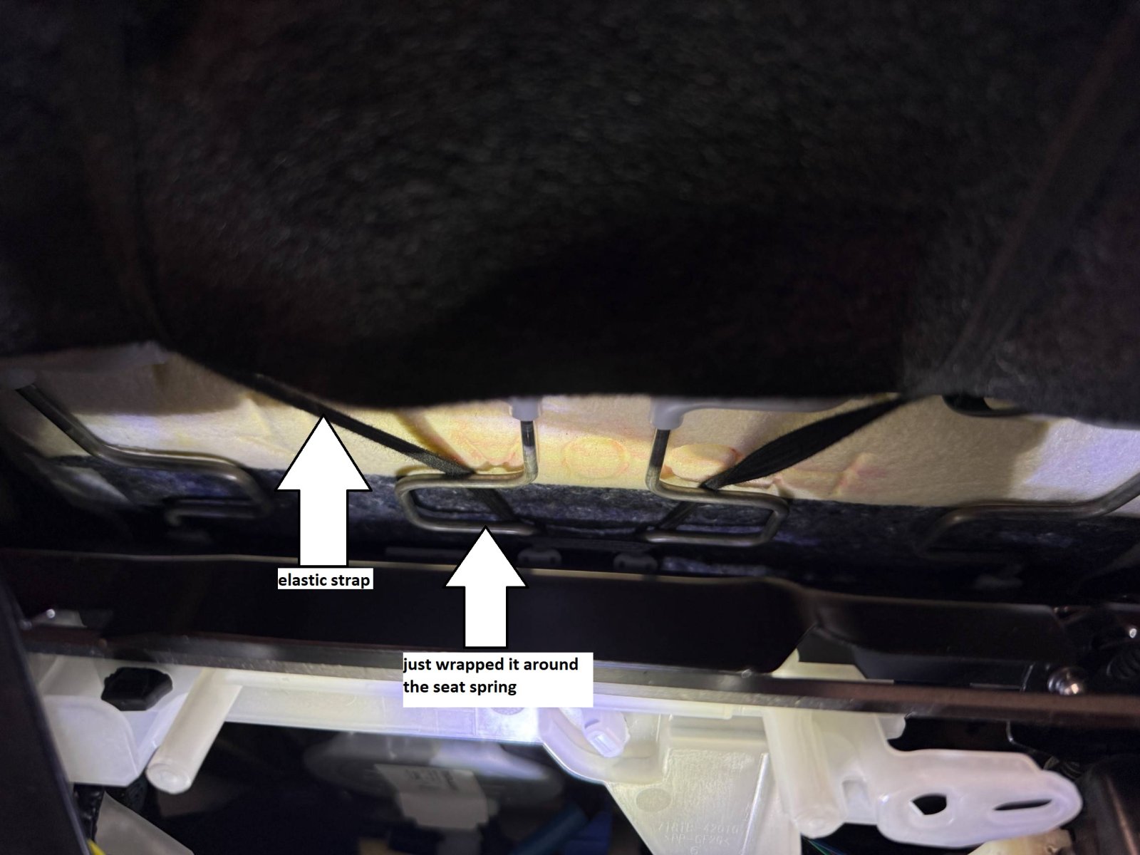 Then fold the mouse fur carpet back down but I've covered the original securing clips so I just pulled the elastic strap down and around the seat springs to hold it in place.