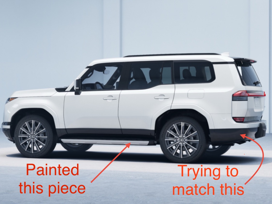 I would appreciate help finding out what the paint color code is for these trim pieces that make up the lower skirt of the GX.