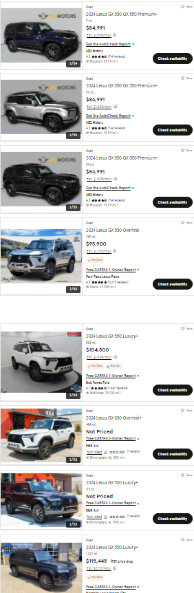 It's been like that for years on the higher end vehicles. Porsche dealers could not add significant mark-up to a GT3 RS, but ones with 120 miles sell at the local dealer for $450K+I was told that some (shady) dealerships are actually doing deals where they sell a GX, or other high demand vehicle like Land Cruiser, to a customer at MSRP, then the customer immediately trades it in on another vehicle, and now the dealership can sell the "used" vehicle for more than MSRP without the same scrutiny as selling a new vehicle with a dealer markup. In some cases the dealership may say new vehicles are "never over MSRP", so this solve that problem for them. I guess I was fortunate to get my OT for MSRP from a good dealership.