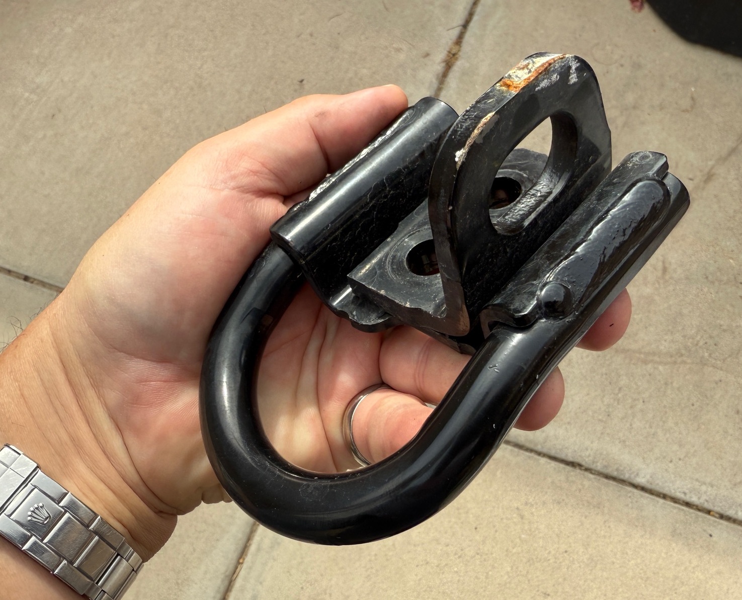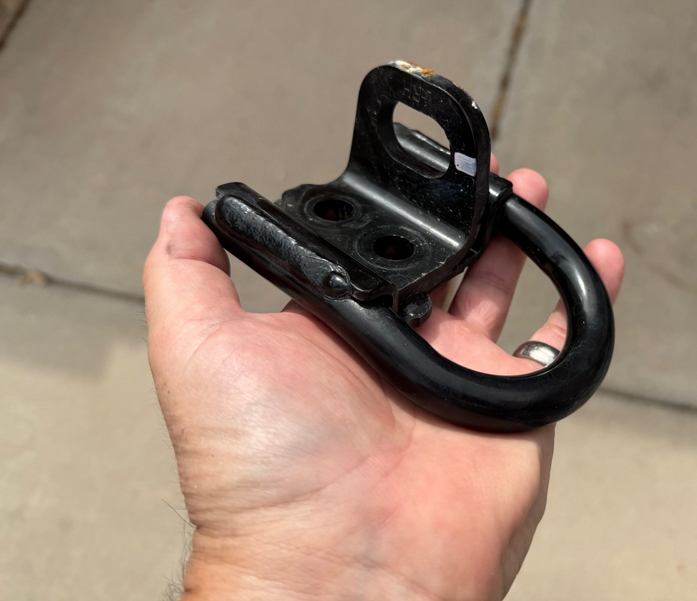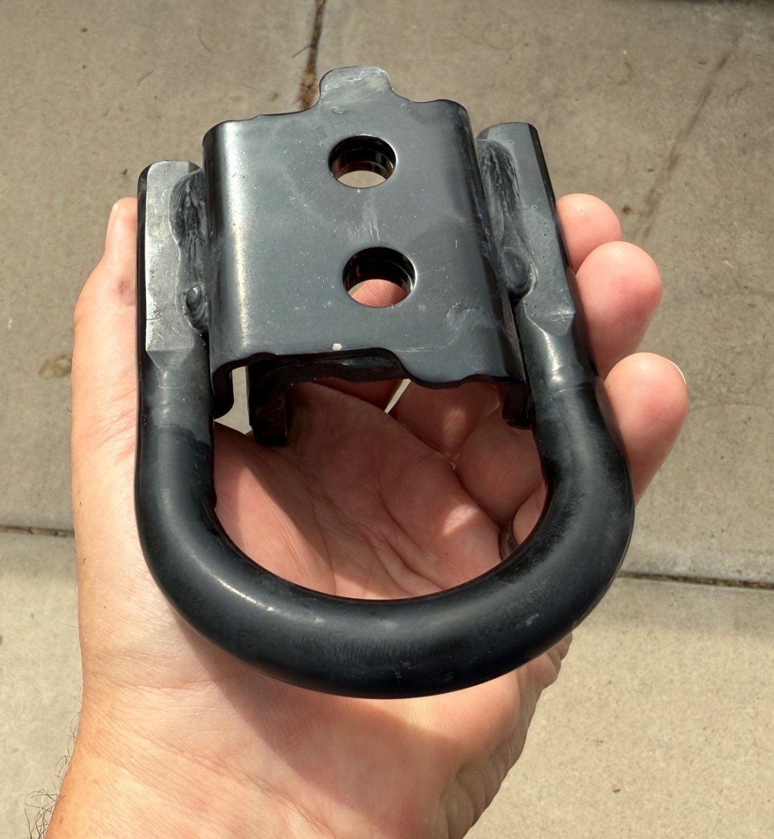 I just grabbed one of the stock recovery points out of my growing pile of stock Lexus GX550 parts. You can see that the stock recovery point incorporates a delivery truck tie-down point that I mentioned before. I didn't even notice this when I took them off.