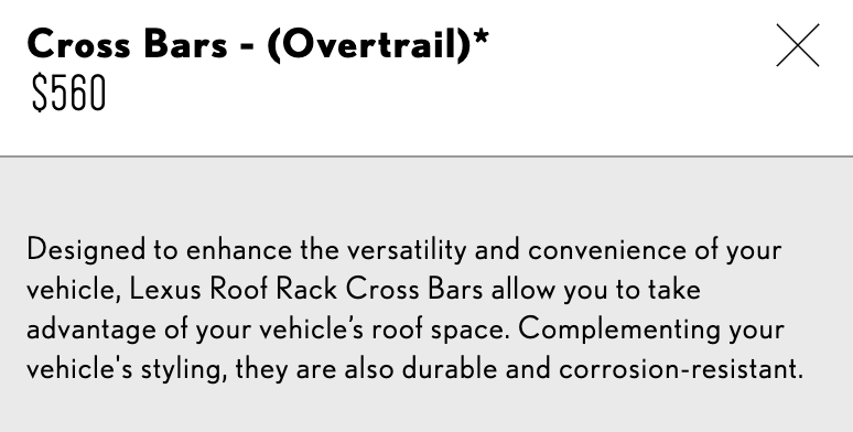 Includes bolts, allen wrench, trim removal tool. I think these will work on other GX trims, but I'm not certain. Lexus shows lighter duty (streamlined) cross bars as options for those on their configurator.