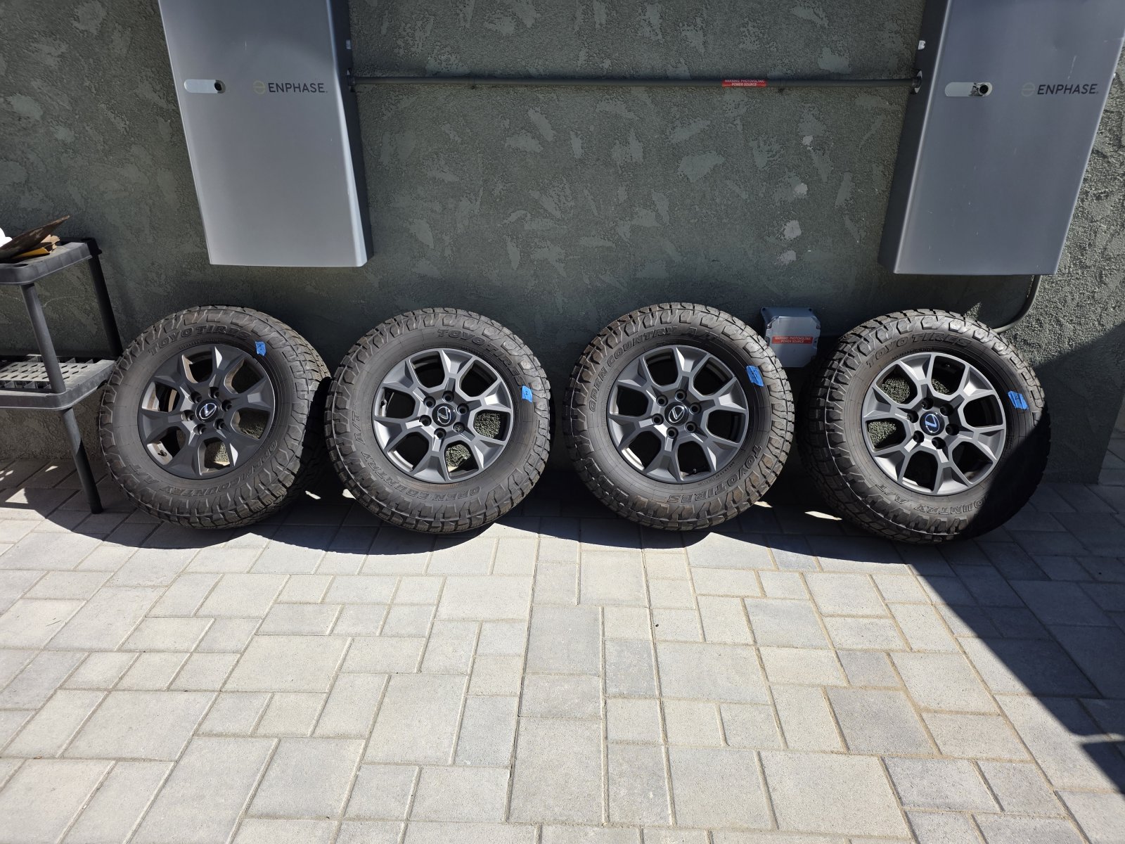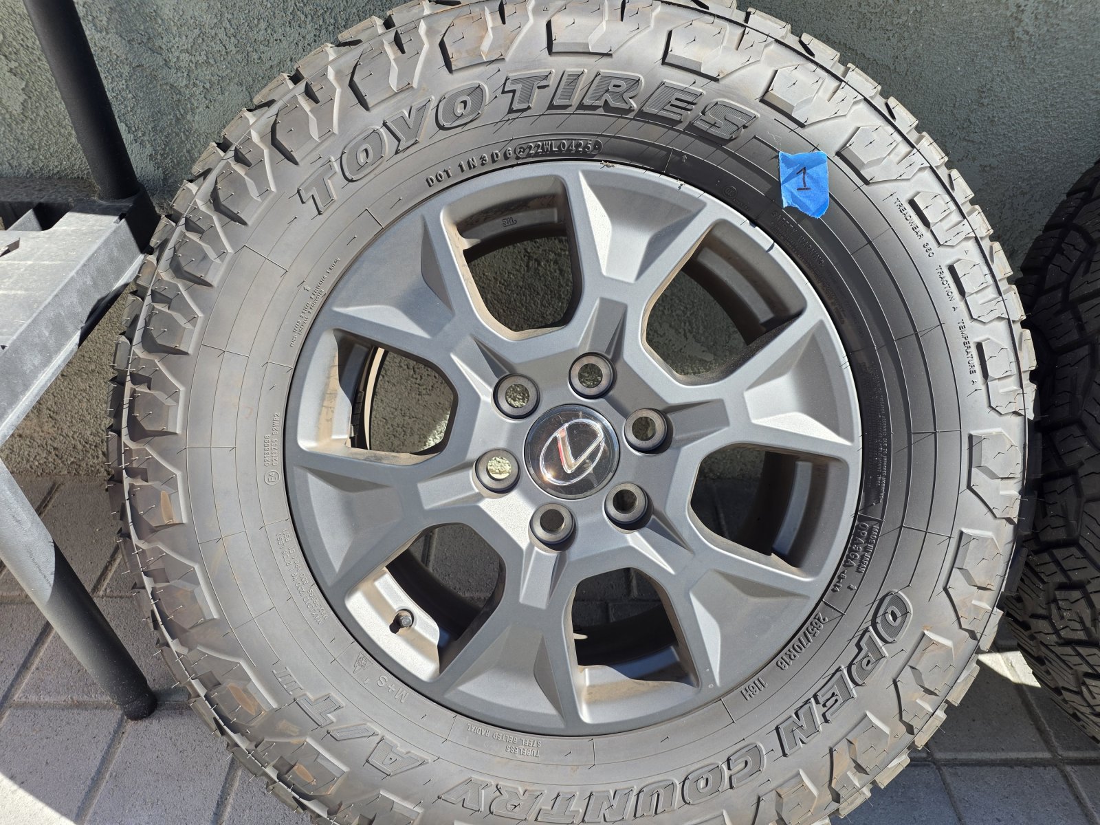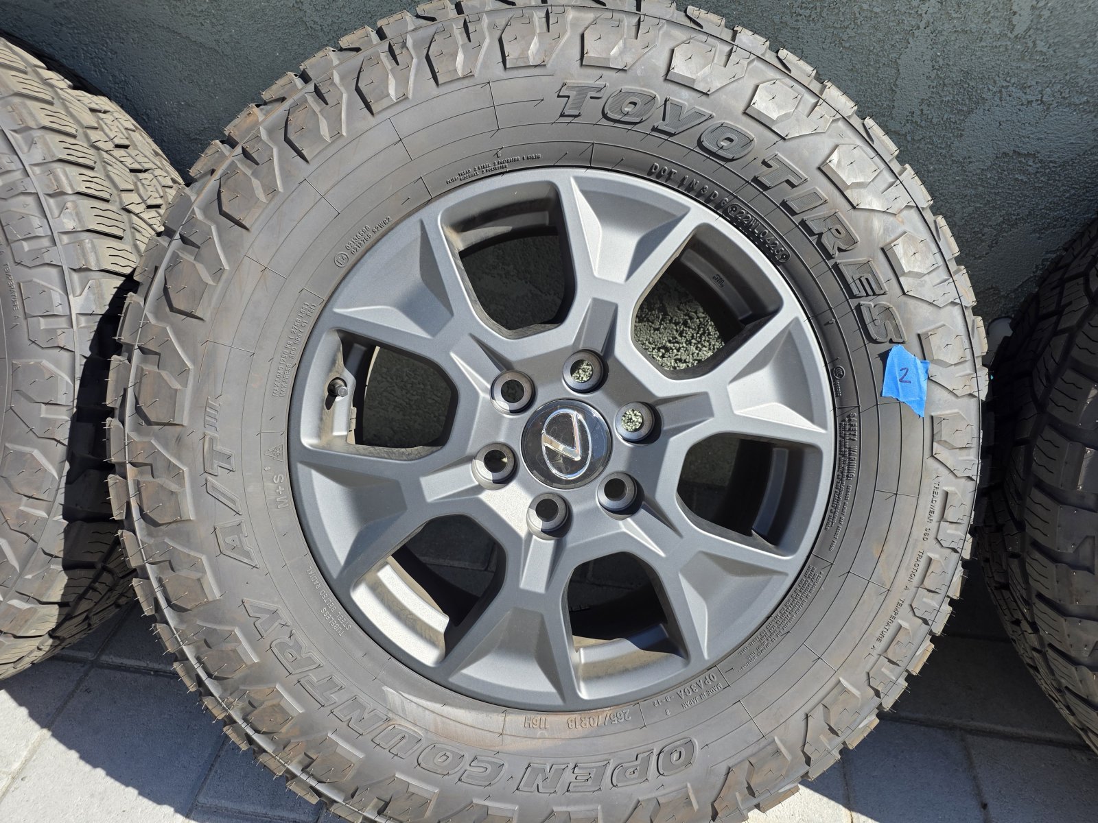 $1000 or best offer. Local pickup in the Torrance, CA area only.No Cash. Electronic payment from verified sources only: PayPal, Venmo, ZelleAll 4 wheels and tires are in excellent condition.Set has less than 2800 miles on them.TPMS sensors are NOT included.Tire Brand: Toyo Open Country A/TTire Size: 265/70R18Wheel Size: 18 x 7.5 +50 offsetWheel and tire set will fit a 2024+ Lexus GX550, 2024+ Land Cruiser, and anything with a 6x139.7 bolt pattern, which Google AI says includes the Toyota 4Runner (1989-present), the Toyota Tacoma (2001-present, 6-lug models), the Toyota FJ Cruiser (2007-2014), the Toyota Sequoia (2001-2007), and the Toyota Tundra (1999-2006). It is the buyers responsibility to ensure proper fitment before purchasing.