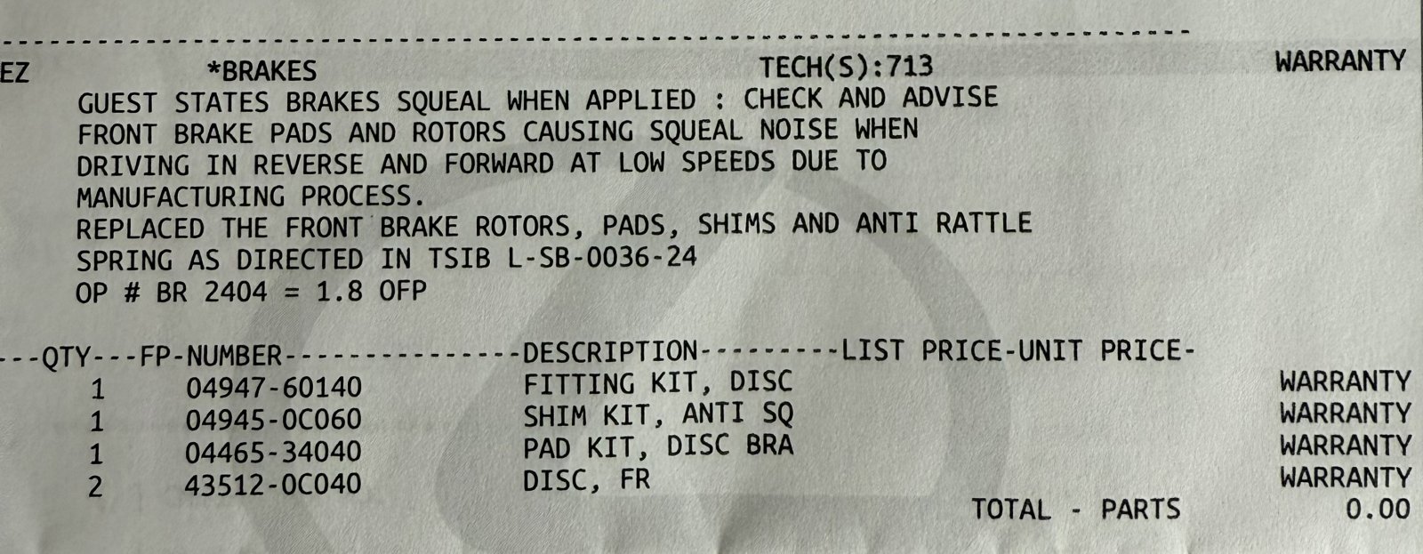 Its just the fronts. This is my actual work order.Has the OP left the building? Would be nice to get an update. In their last post, #40, they say the rear brakes were replaced but other posts said just the front. I'm assuming they just had a typo in that last post.