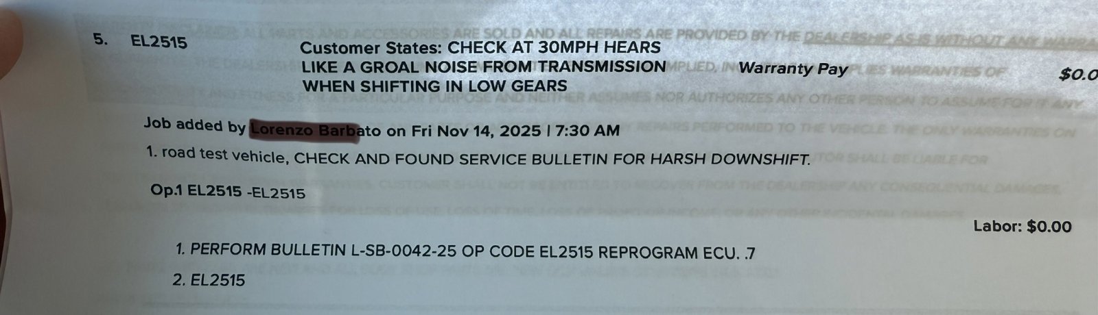 Hi all, I want to report that from day one with my 2024 550, I’ve experienced a transmission growling noise around 10 and 27mph when I light tapped the throttle. Dealer was reluctant to perform the bulletin, but when they connected the vehicle to their servers, they did go through and apply the software update. The manager told me that they are seeing this as a common issue in the 2024s and the software update doesn’t completely fix the growling noise but it does minimize it. I would say it’s about 70% less now. I still notice the transmission growling a bit and hunting around 35mph. Anyway, hope this helps someone if you’re seeing the same noise.
