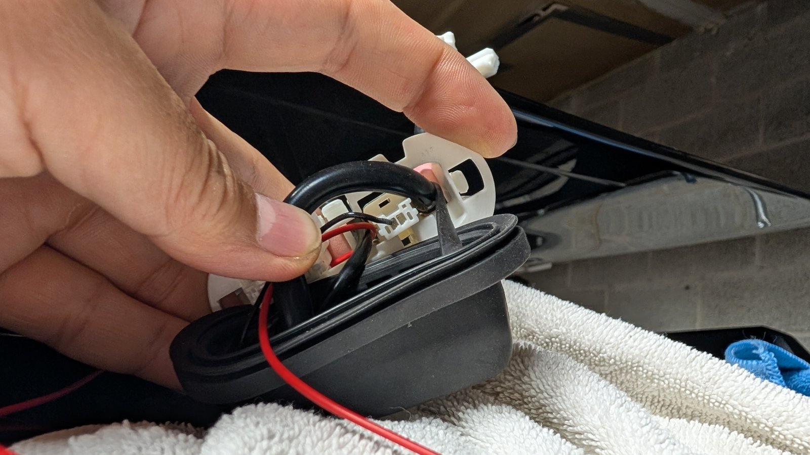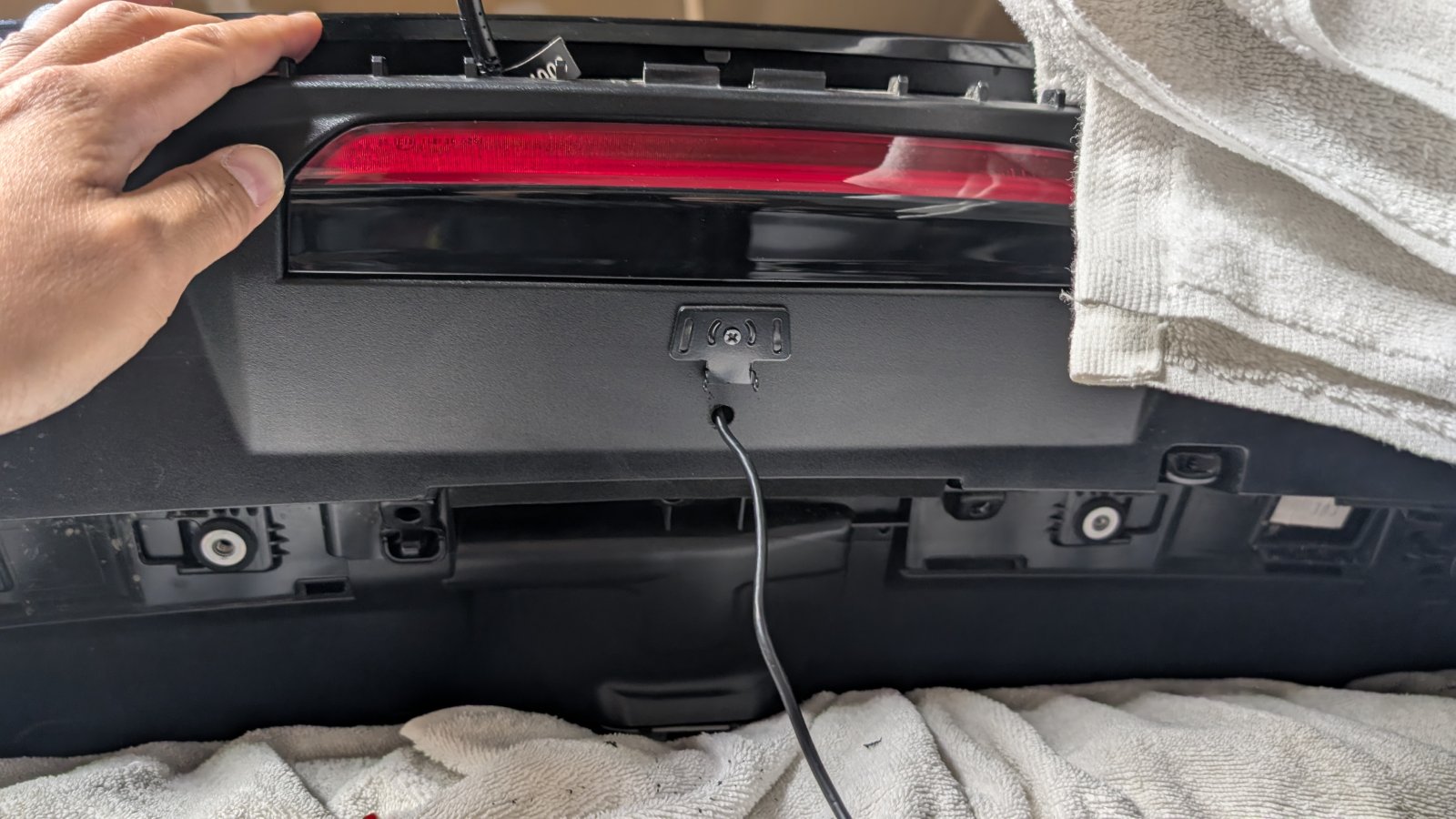 After detaching the rear spoiler, I used a few plastic trim pry tools to separate the top and bottom portions of the spoiler. One side is held on by rows of tacky double sided tape so best I could do was prop it open while the camera was being mounted. After the camera was attached with a screw for extra security, the wires were run through and hidden inside the center rubber boot. I used a bit of black silicone to seal off the whole i drilled for the camera wire.