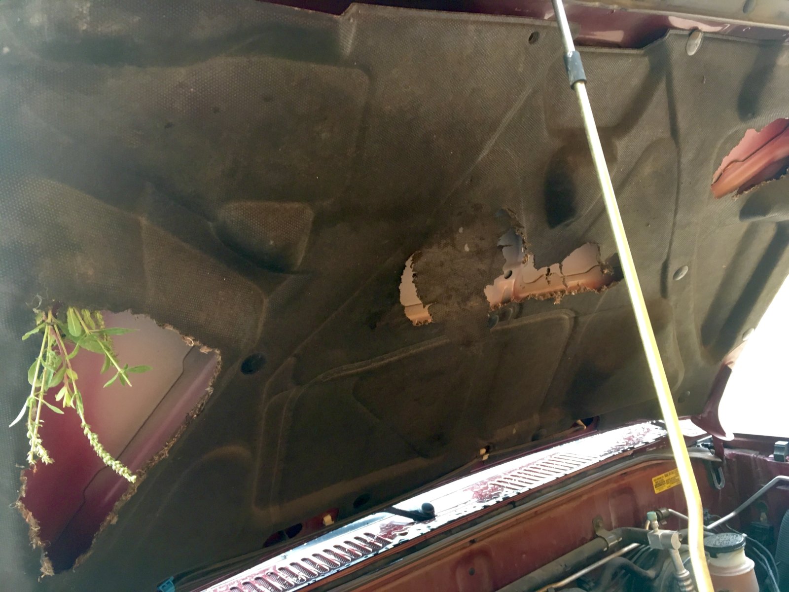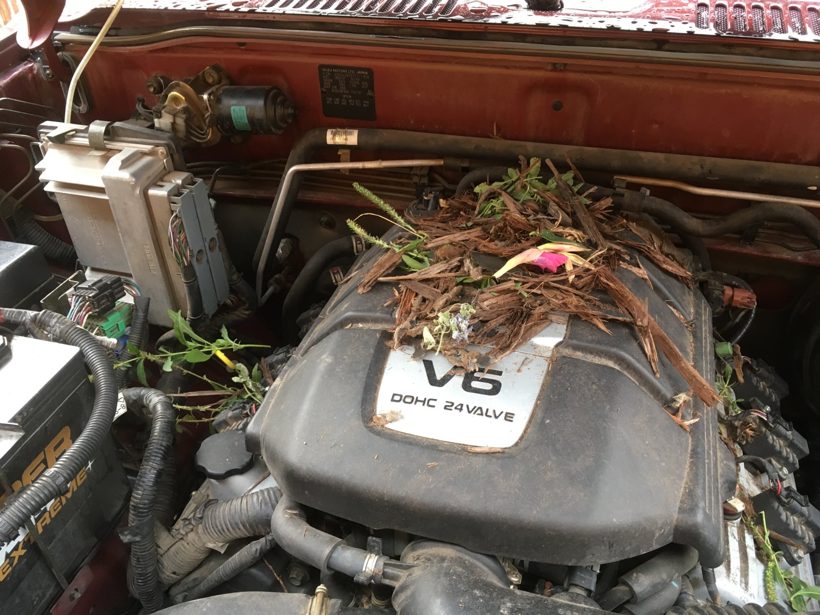 I drove it for an hour and took it up on the freeway to get it hot. Made some power passes. Pulled into an Autozone for something and opened the hood. I started banging on all the plastic covers and BOOM! out comes Rotty the rotten Rat. He jumped out of the battery cover and over the back of the engine and down again. I banged all around. Nothing. Got home and got my compressor going and used a long air gun to blow out everywhere. Nothing. But I have a plan. My plan is for him to rot starting soon.